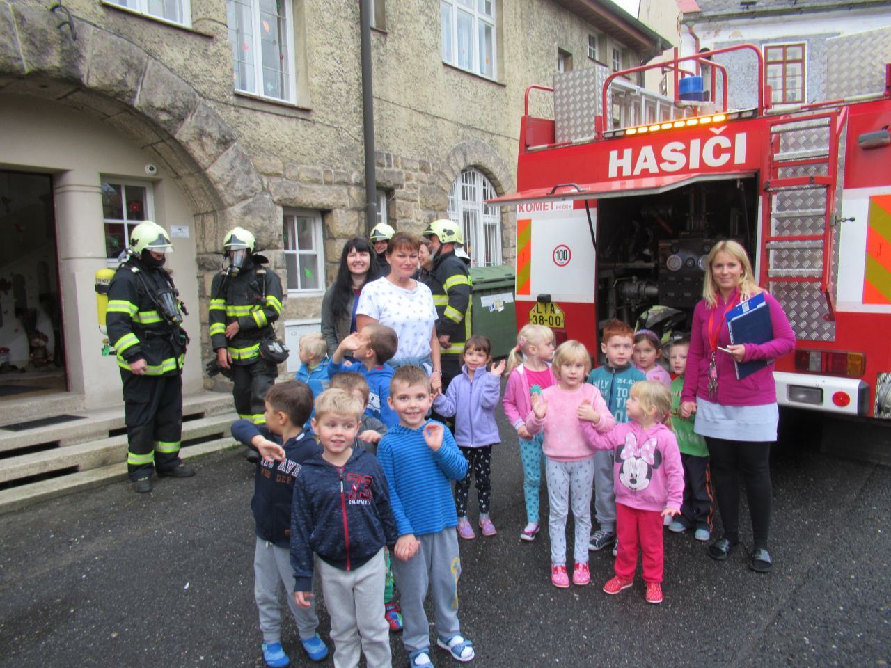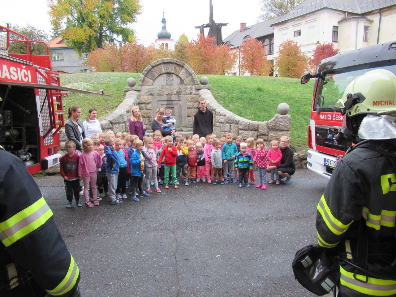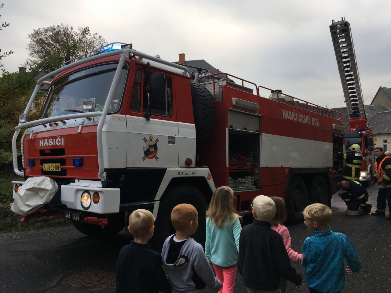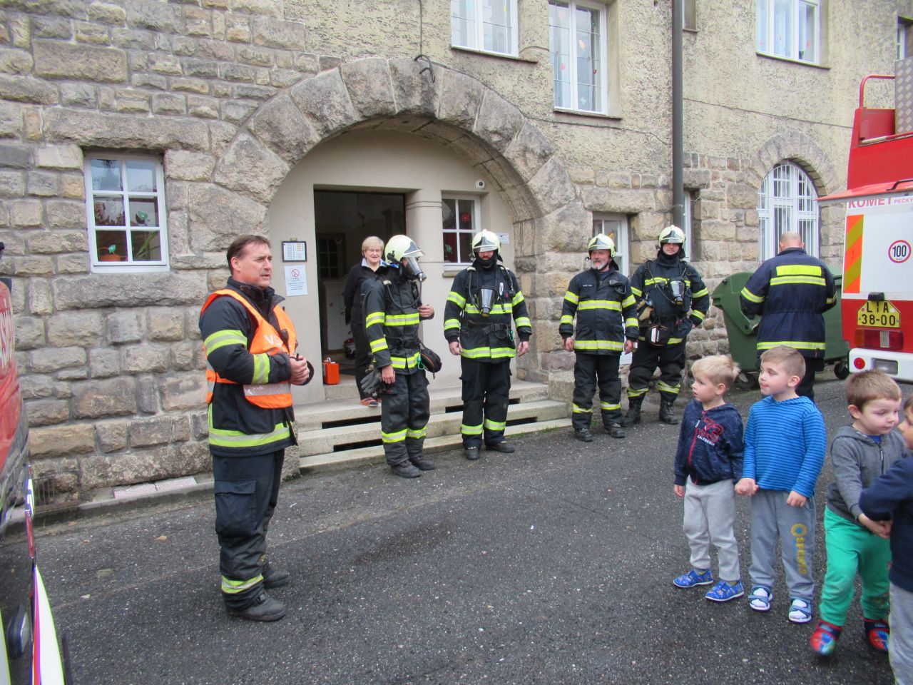 V úterý 15. října proběhl v MŠ cvičný požární poplach. Odměnou za statečnost byla pro děti prohlídka hasičských vozů, jejich vybavení a popis postutpu hasičů v případě požáru.